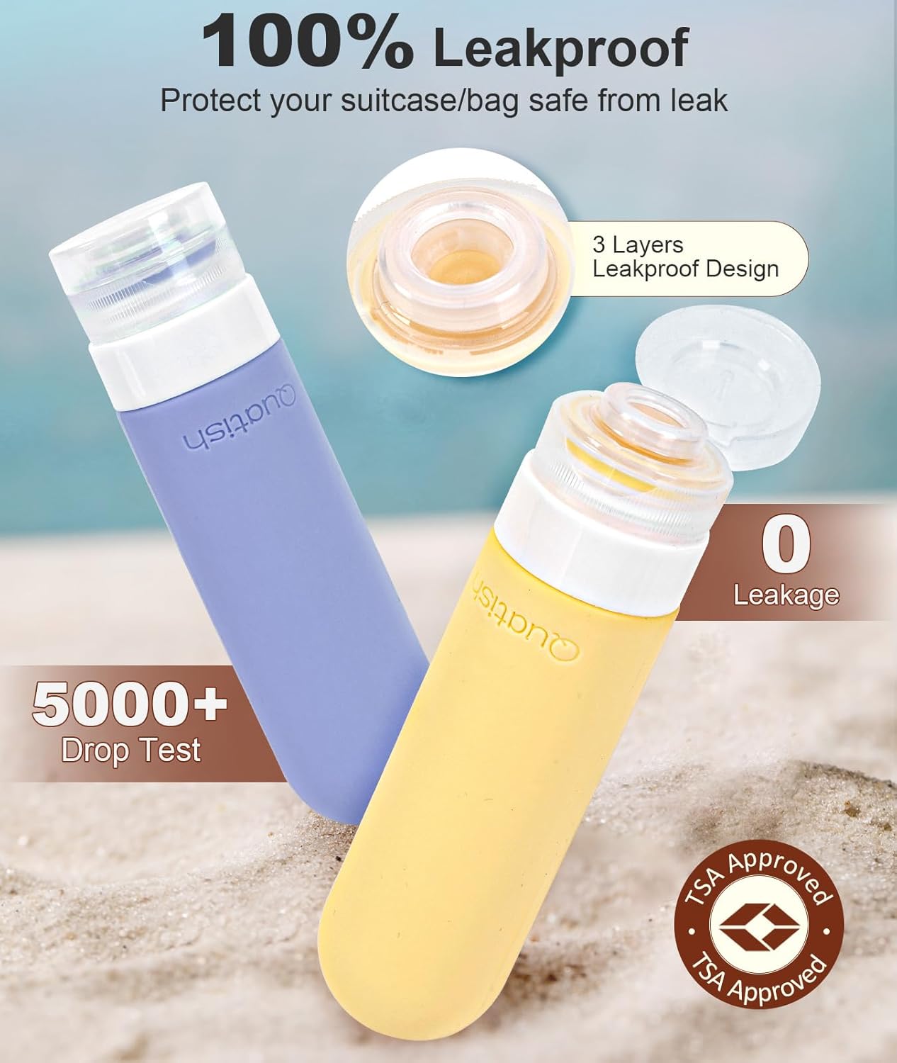 100% Leakproof Travel Essentials: Our products have a 3-layer lid design, with firm seals, keeping the liquids securely inside the container to prevent leaks, protect your luggage. There were no leaks when we tossed them off the ladder