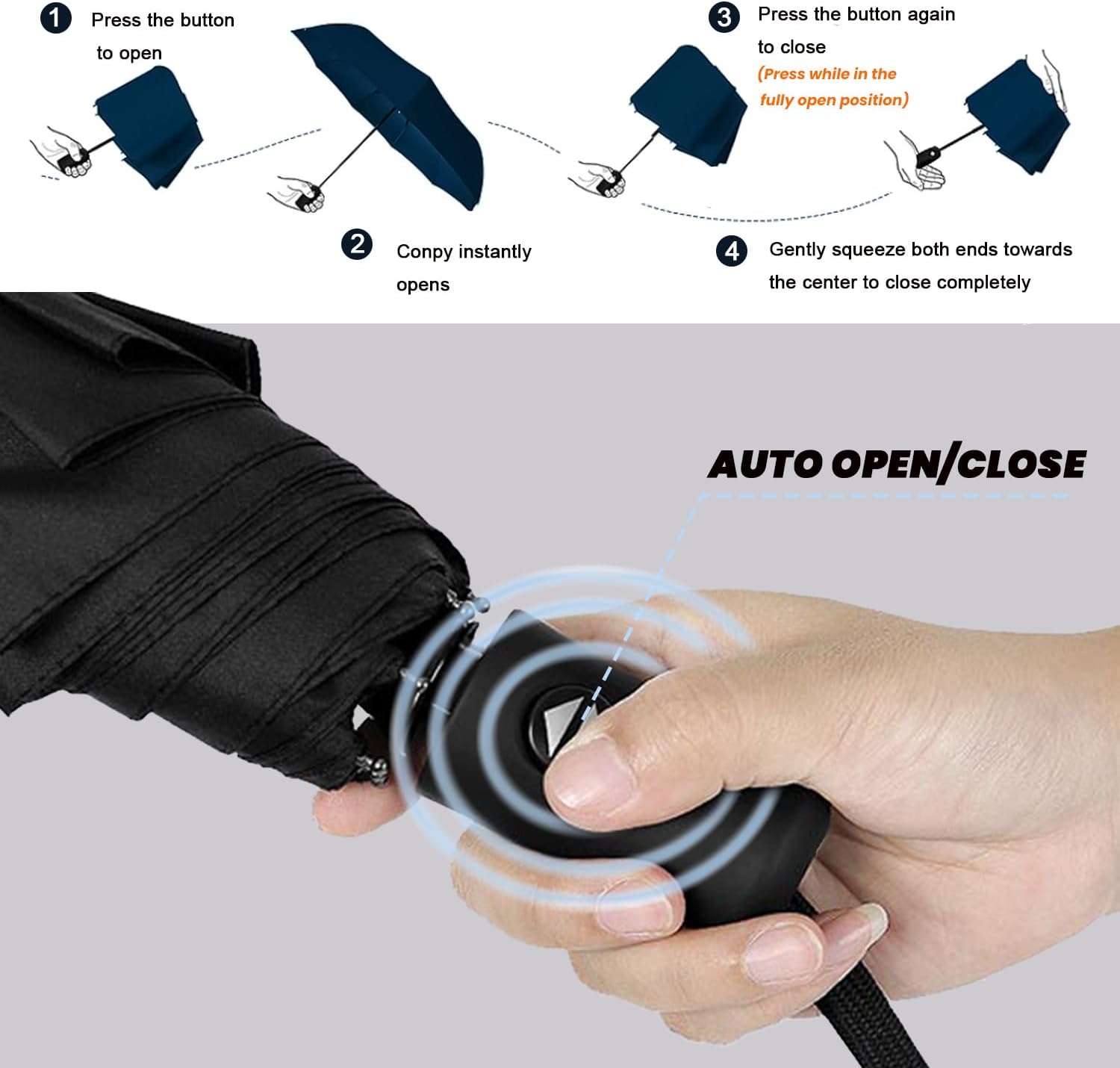 Upgraded Automatic Umbrella- Easy one hand operation with one auto open & close button, simply touch it to expand or collapse;